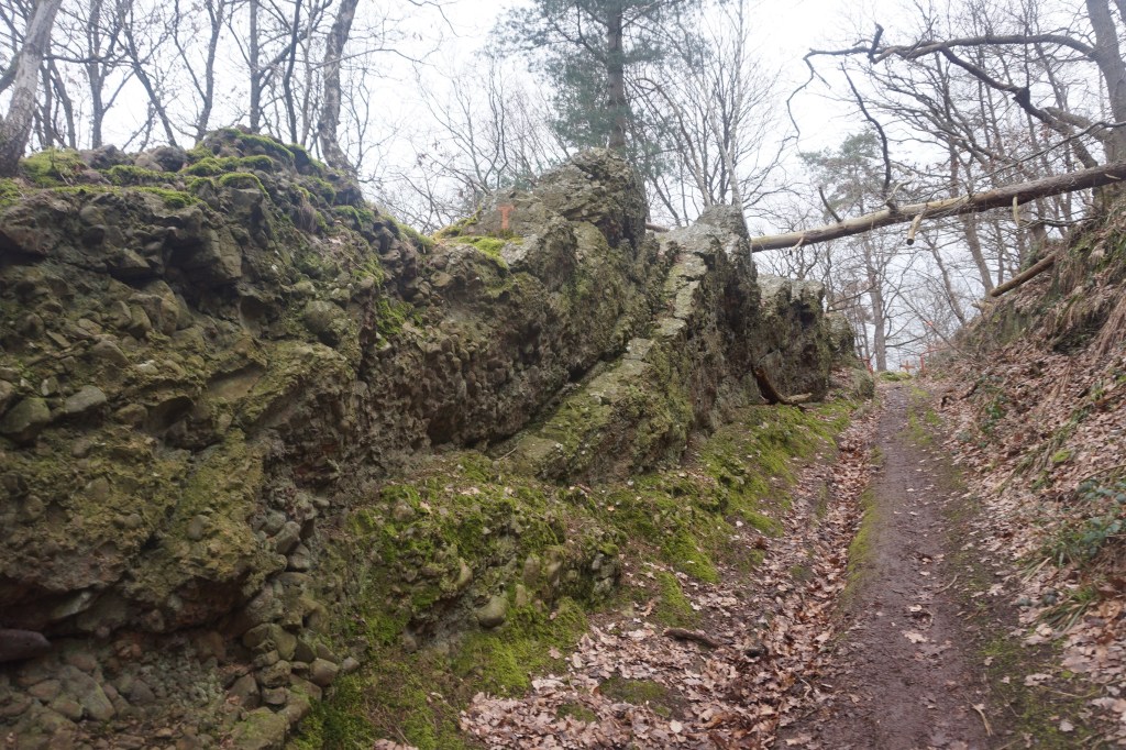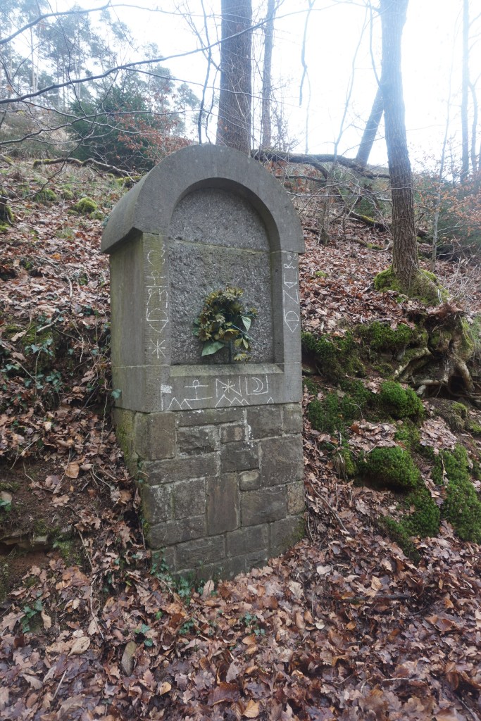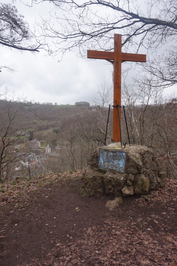 Un magnifique chemin en partie taillé dans une roche que je ne vous présente plus, (je vous en ai déjà parlé lors de ma descente de l’Aisne ou de marches du côté de Wéris) nous mène à la Croix Saint-Jean qui domine le village de Fraipont et la vallée de la Vesdre qui serait, selon Victor Hugo, « la plus ravissante vallée qu’il y ait au monde » ! Rien que ça !