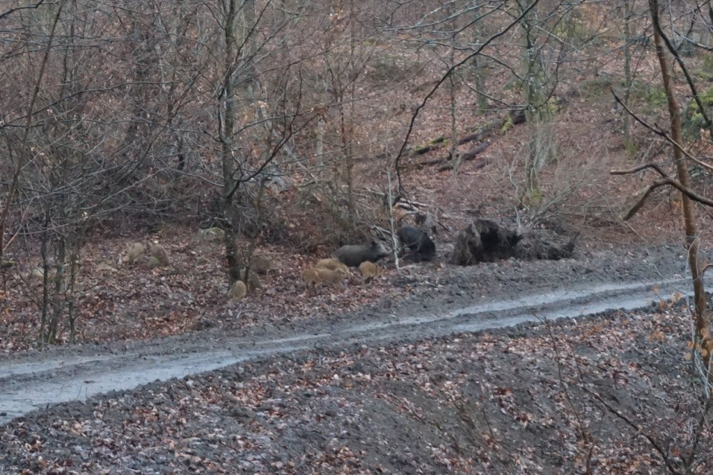 Dommage, je rate quelques beaux clichés ! Mais il y en a quand même un qui me fait plaisir et que je n’aurais pas voulu rater : une famille de sangliers au grand complet !