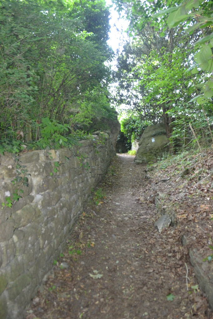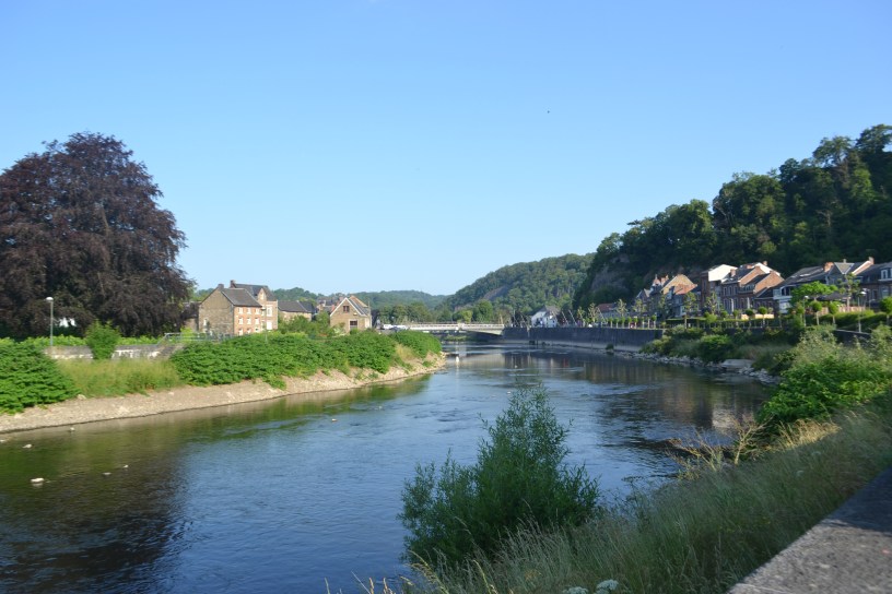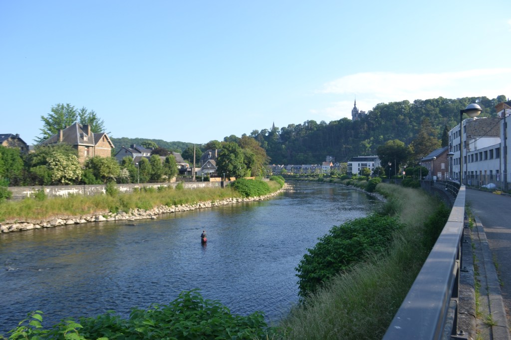 Un petit coup d’œil en arrière sur un tronçon le long de la berge nous permet de voir le château et l’église et visualiser l’anecdote racontée un peu plus haut.
