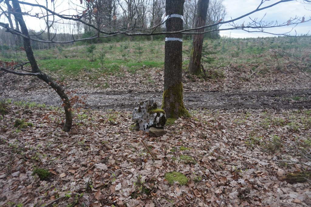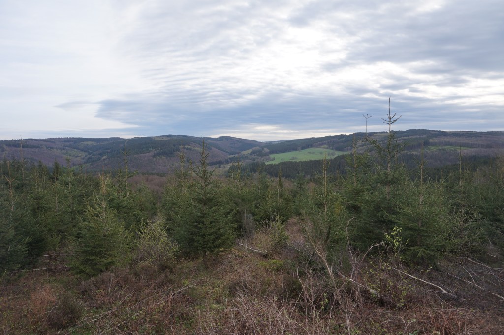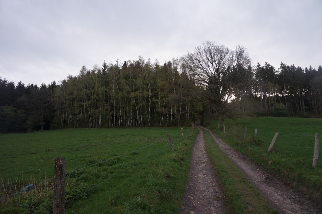 Après avoir longé Les Pierris, une petite lande de terres devenues incultivables, jonchées de pierres et où ne poussent plus que les fougères quand la saison est là, nous arrivons dans la forêt juste avant que quelques gouttes de pluie me rappellent que l’Ardenne est un peu la Bretagne belge et pas seulement en ce qui concerne les légendes !