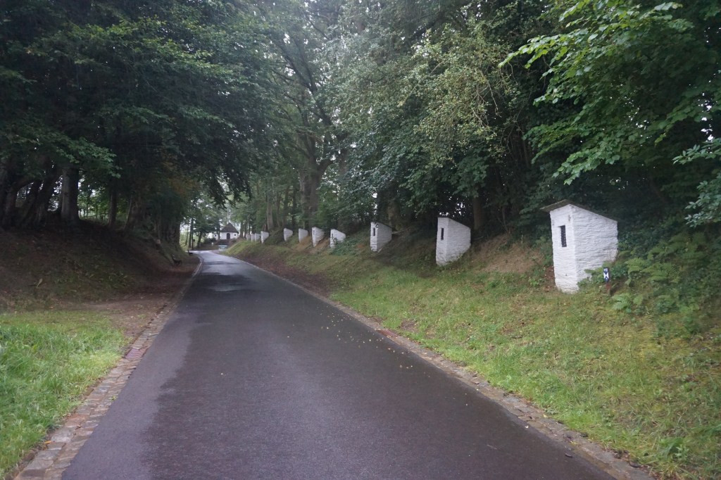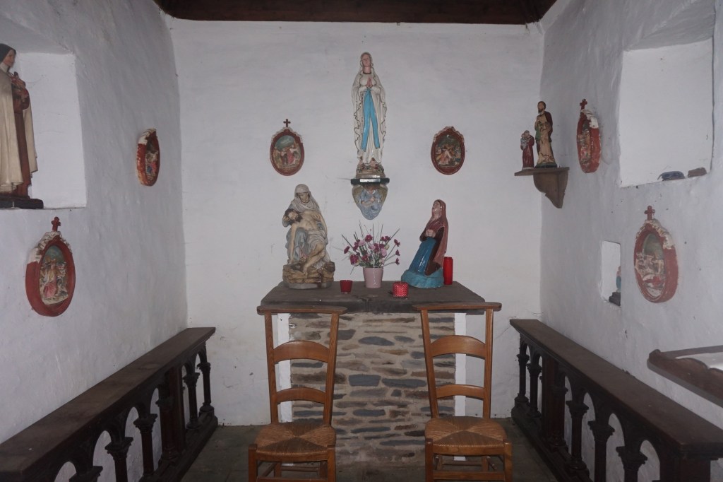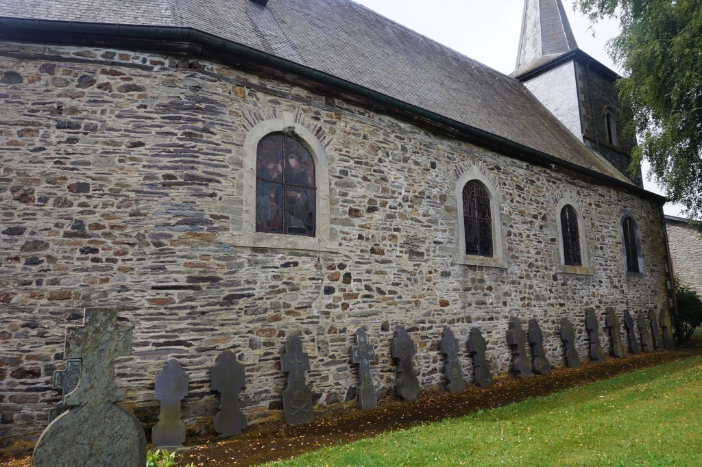 Et on y va par un beau petit chemin bordé d’un magnifique et très rare chemin de croix aux stations en schiste, aujourd’hui blanchi et qui mène à une petite chapelle toute aussi intéressante. Ce calvaire est déjà noté sur les cartes Ferraris de 1775 et aurait été construit sous la direction d’une ancienne religieuse, Anne Massoz, qui s’était retirée dans le village.