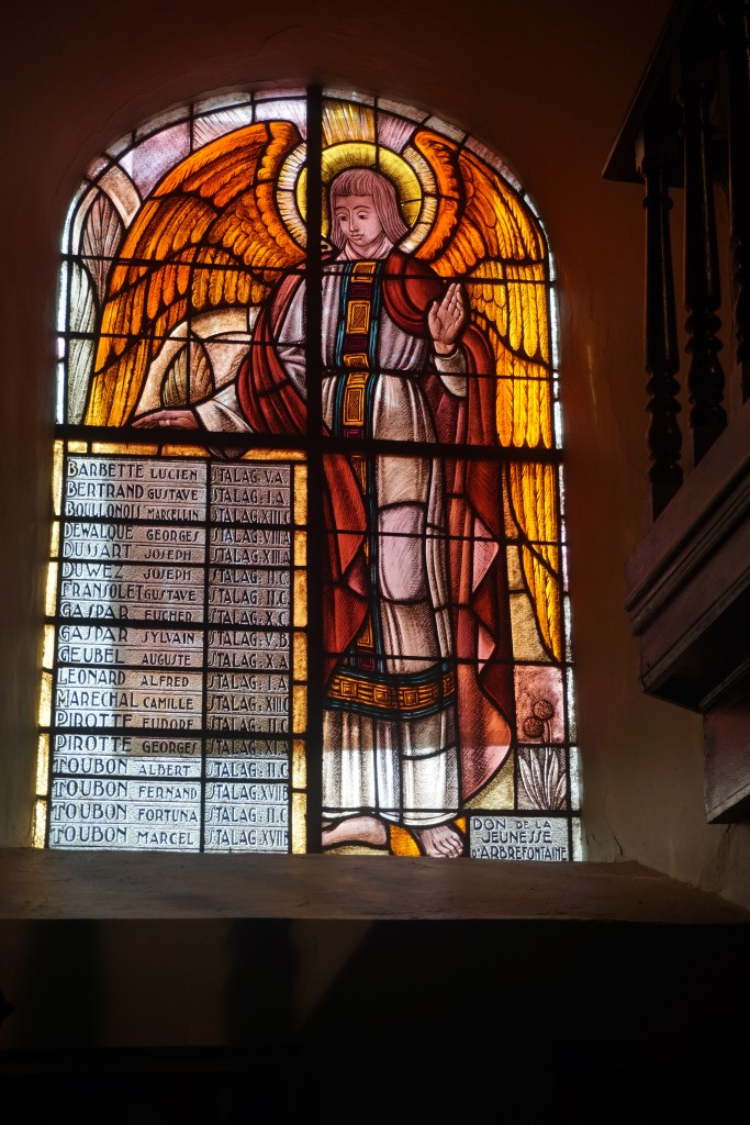 Avant de rentrer, je prends le temps de découvrir la belle petite église Saint-Maurice, avec son plafond en bois peint et ses vitraux dont l’un comporte les noms des 18 prisonniers originaires du village et qui sont revenus vivants des camps de prisonniers allemands à la fin de la deuxième guerre mondiale !
