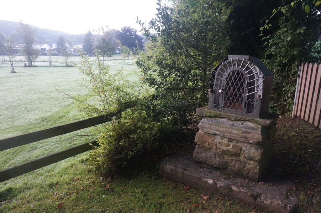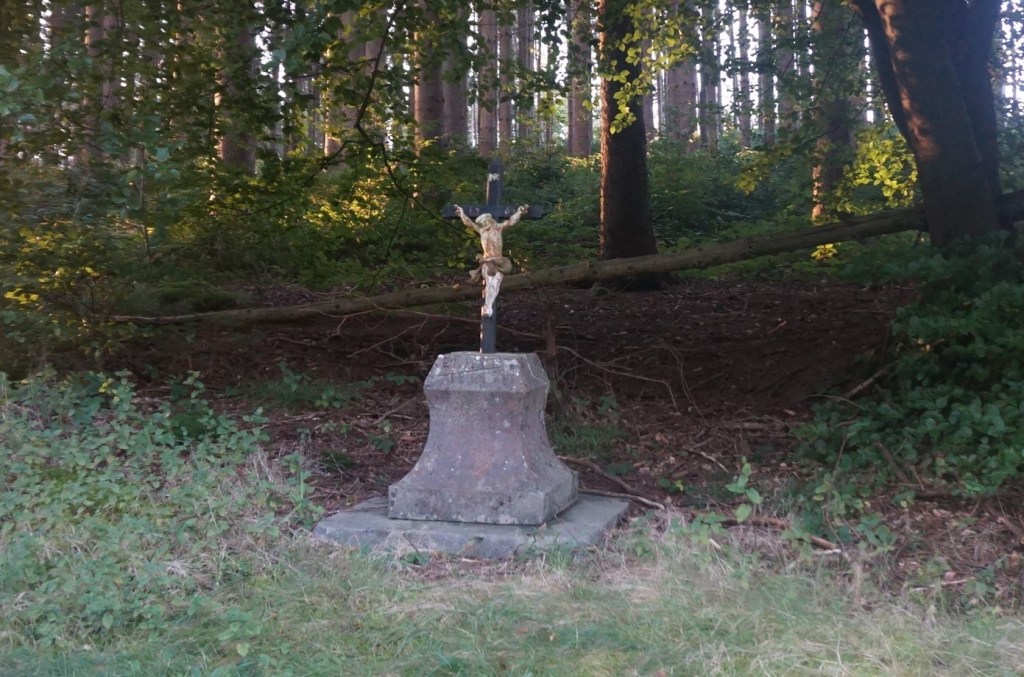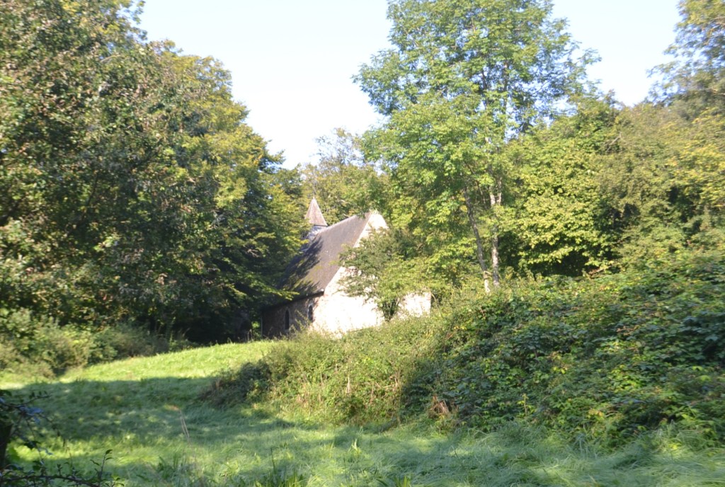 Longue ligne droite dans le bois des Fagnes pour arriver, par Trou de Bosson (petit hameau aujourd’hui disparu), à la célèbre chapelle Ste-Anne-du-Pouhon, dernier vestige d’un autre hameau disparu.
