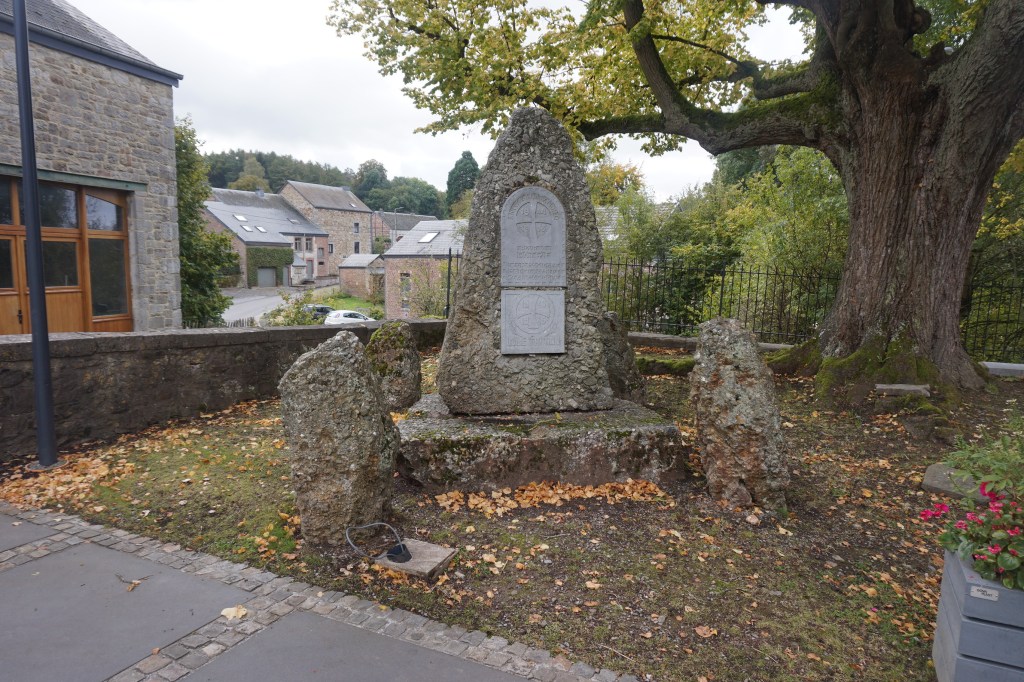 Un des meilleurs exemples d’utilisation de la pierre de poudingue de la carrière, le monument aux morts près de l’église de Wéris.
