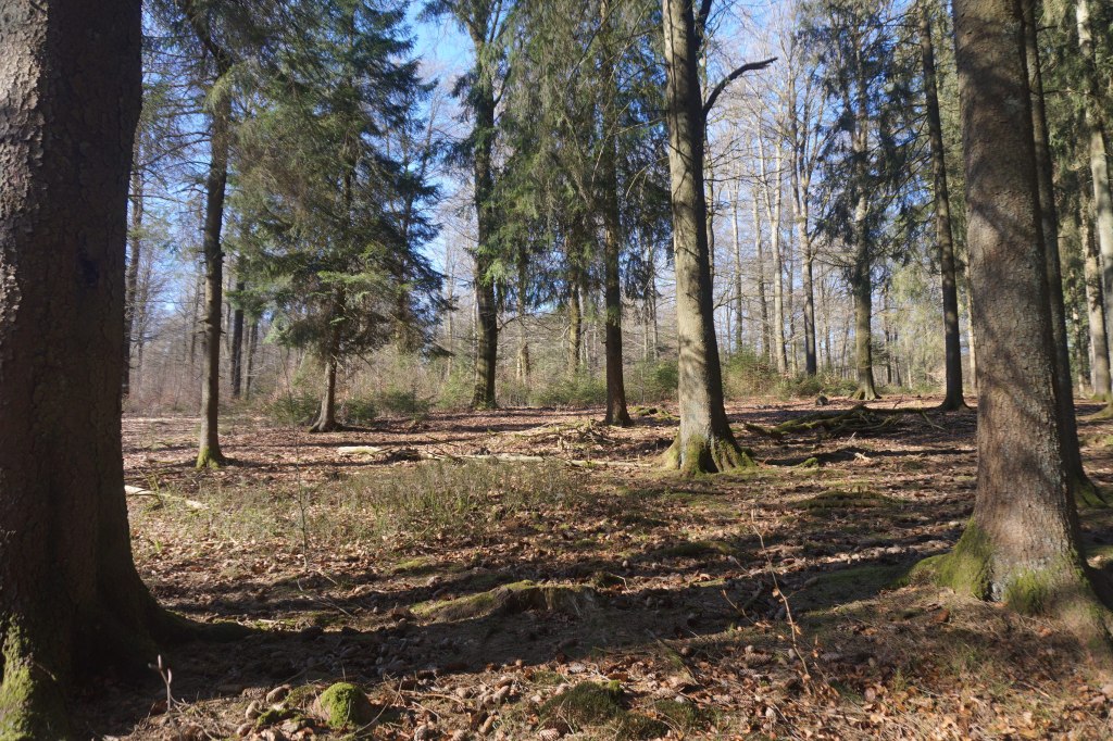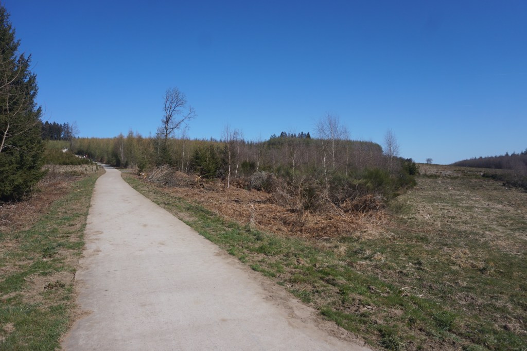 Peu de petits sentiers ensoleillés, mais de larges chemins en ligne droite et plutôt monotones tracés à travers bois pour les engins de débardage.