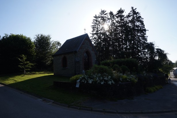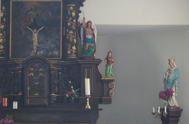 Après un dernier tronçon dans la campagne, j’arrive à la belle petite église Saint Michel de Sberchamps. C’est fermé, mais je réussis à apercevoir une belle statue de mon saint patron préféré. C’est un peu pour cela que j’avais aussi un peu choisi cette destination 😉.