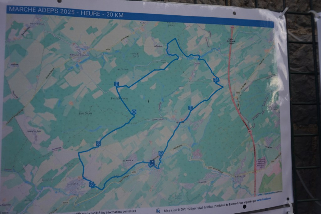 Le parcours des différents itinéraires et quelques explications intéressantes sont affichés. On a affaire à des pros : c’est le Royal Syndicat d’Initiative de Somme-Leuze qui nous offre la balade du jour !