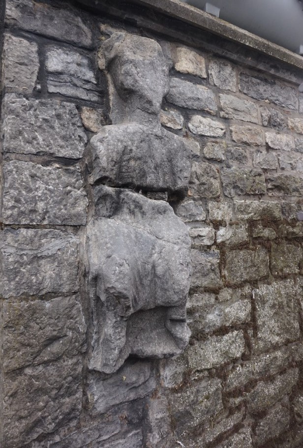 Sur la place, cachée derrière une tente, une curiosité historique attire mon regard. Il s’agit d’une statue ancienne maçonnée dans le mur. Il s’agirait de « Cupidon », Dieu de l’amour et « plus ancien habitant de Walcourt », selon la légende.