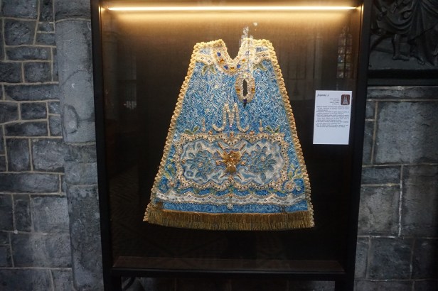 J’attends patiemment la fin pour la visiter et admirer la magnifique exposition temporaire de la garde-robe de Notre-Dame, composée d’une quarantaine de tabliers qui vont des plus simples aux plus richement décorés et confectionnés au cours de ces deux derniers siècles.