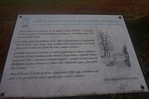 Un peu plus loin, comme souvent à la campagne, une croix de carrefour est dédiée à Saint Donat, un des saints les plus vénérés en province de Luxembourg.