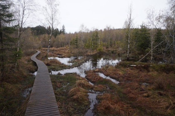 Par endroits, un caillebotis a été installé, pas seulement pour éviter de nous mouiller les pieds, mais aussi pour nous contraindre à respecter le chemin et ne pas piétiner la flore particulière de ces tourbières.